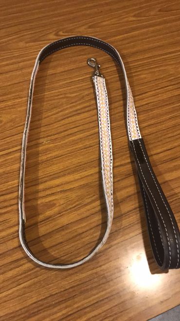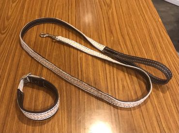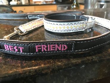 Leashes are made with matching embroidery on one side. Included is an embroidered message/name/phone number up to 10 letters or numbers. Made with the same soft leather on one side and a nylon back for durability. Each collar and leash are designed with matching embroidery colours and pattern. Each design is unique to that combination. Just like snowflakes no two are the same.