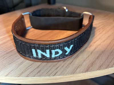 Martingale collars are designed for walking your dog. Giving you control and safety making it difficult for your pup to slip their collar. Our collars are padded with leather with a nylon core for durability. Rings are stainless steel. The top is embroidered leather with colours of your choice. Approximately 1/3 of the collar is nylon loop just giving you enough control without over tightening. They can be made adjustable for a flexible fit. The nylon loop can be backed with soft faux leather for greater comfort or add a name or phone number for extra security. Our collar s are durable, beautiful, practical and easy to use. As a precaution we recommend always removing any martingale type collar when your dog is not being walked on leash.