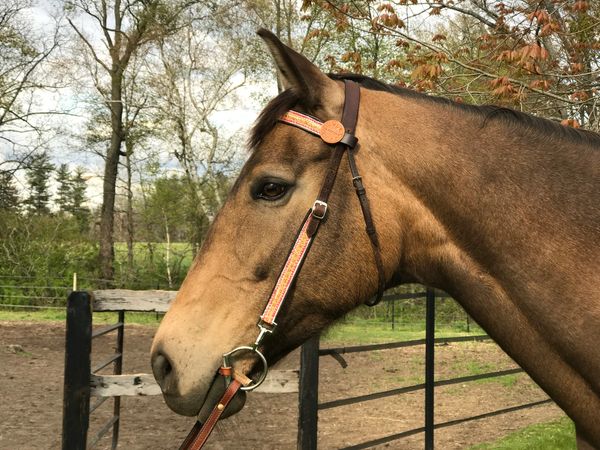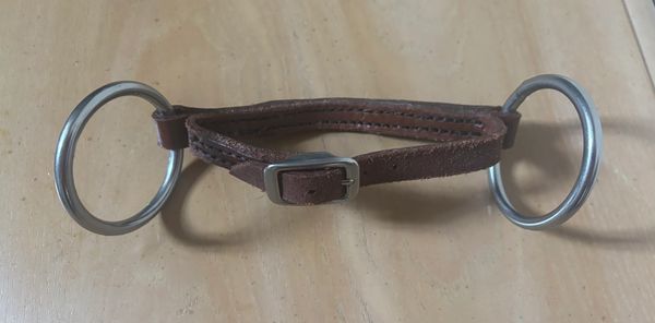The War Bit is available with a 2 inch Loose Ring and is made with veg tan leather and double stitched for safety and to help prevent stretching. It is pre oiled before shipping to you. This bit has a unique fit with a chin strap that is designed to hold the bit in place. This bit is designed to be used with or without a headstall or bridle but we do suggest using a head stall or bridle when first introducing this bit to your horse.